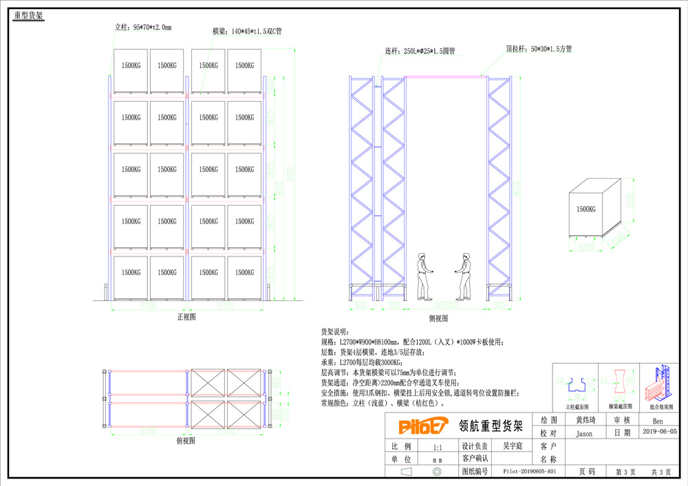 重型貨架由于存儲(chǔ)物品較重,需配合卡板和叉車使用。這次我們?cè)O(shè)計(jì)的高位重型貨架高度是8.1米,四層橫梁五層存放。客戶使用窄通道叉車,我們?cè)O(shè)計(jì)的通道≥2.2米,雙排重型貨架之間用250mm的拉桿連接,并結(jié)合客戶使用的是1200(入叉)*1000mm的卡板,重型貨架尺寸設(shè)計(jì)為: L2700*W900*H8100mm。