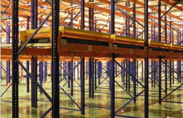 后推式貨架是為提高保管效率而設計的形式,其原理是在前后橫梁間以多層臺車重疊相接,在貨架前端將貨物置于臺車上,后存儲貨物時叉車會將原先貨物推向里面。